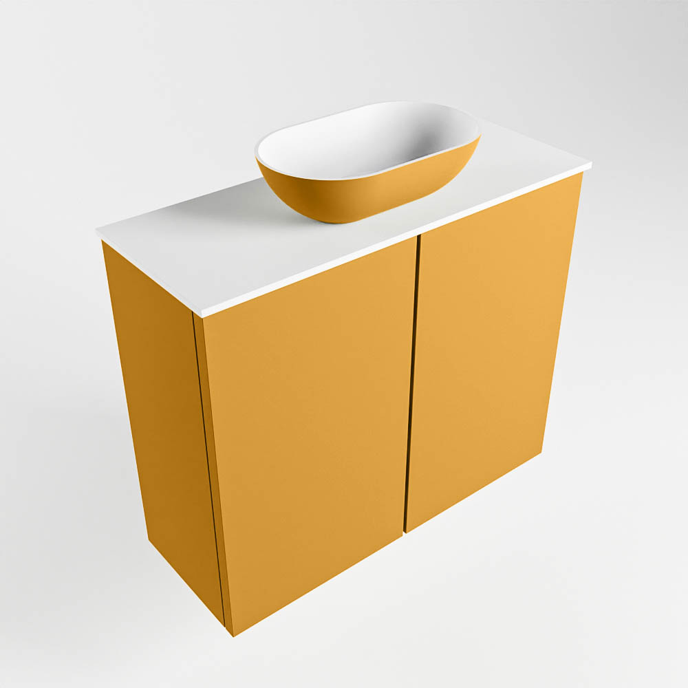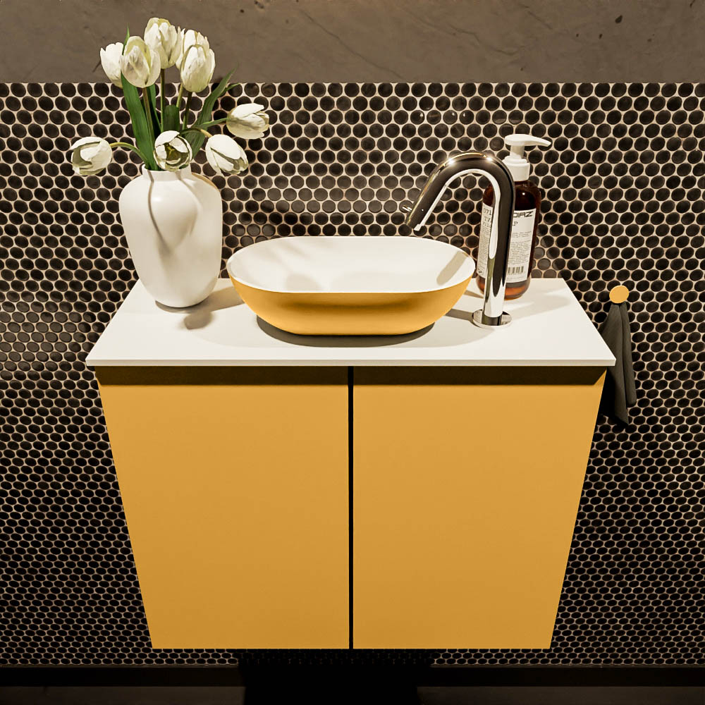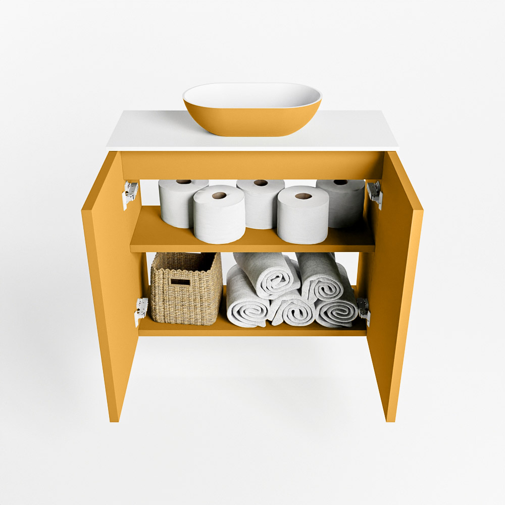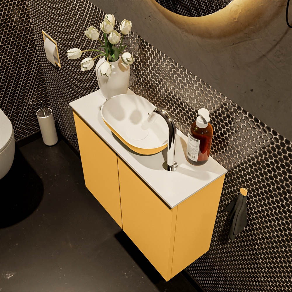 Met zijn fraai vormgegeven kom en elegant bovenblad, vervaardigd uit Solid Surface materiaal, straalt de toiletmeubel set FOWY stijl en klasse uit. De kleur van het kastje met zijn handige push-to-open deurtjes kan harmonieus worden afgestemd op de tint van de wastafelkom. Met deze set transformeert u moeiteloos uw toiletruimte tot een oase van prachtig design en luxe.