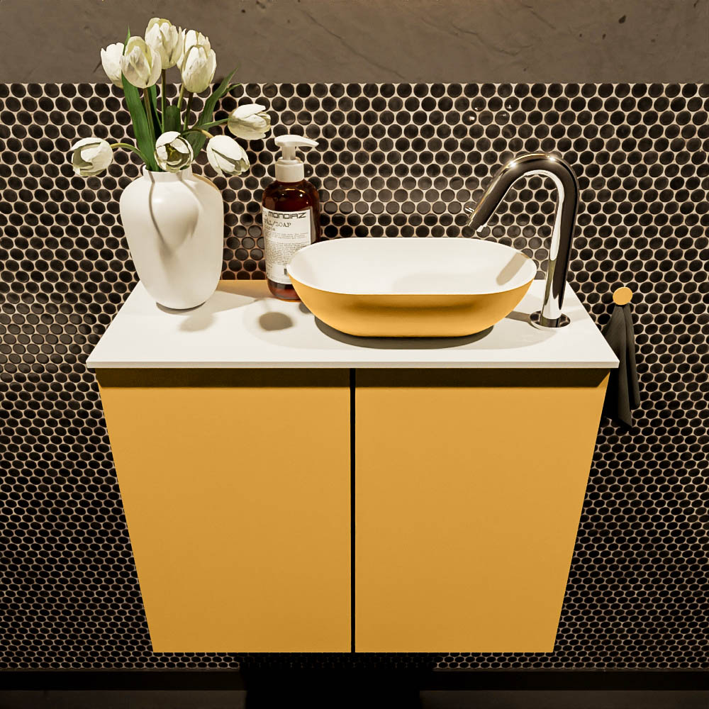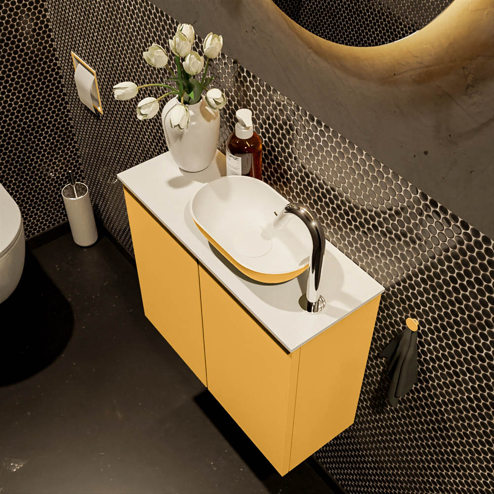 Met zijn fraai vormgegeven kom en elegant bovenblad, vervaardigd uit Solid Surface materiaal, straalt de toiletmeubel set FOWY stijl en klasse uit. De kleur van het kastje met zijn handige push-to-open deurtjes kan harmonieus worden afgestemd op de tint van de wastafelkom. Met deze set transformeert u moeiteloos uw toiletruimte tot een oase van prachtig design en luxe.