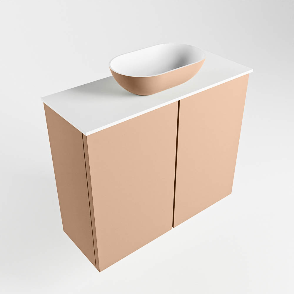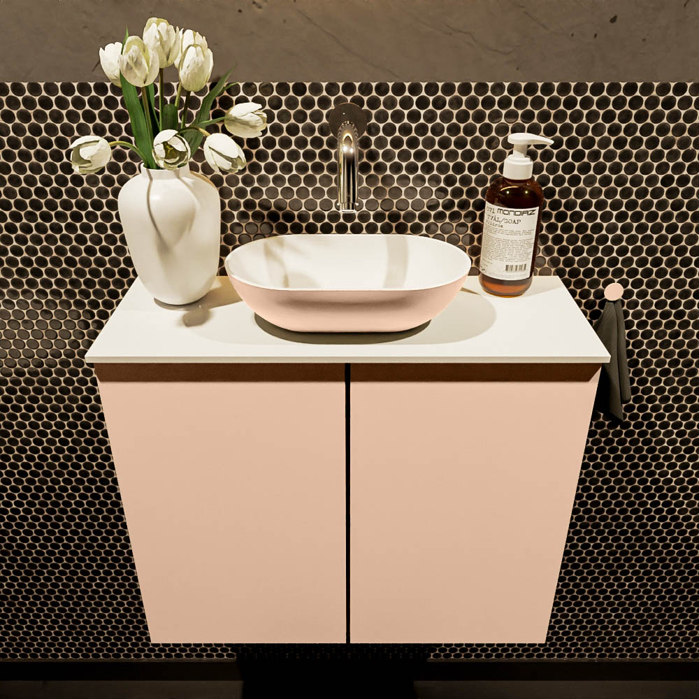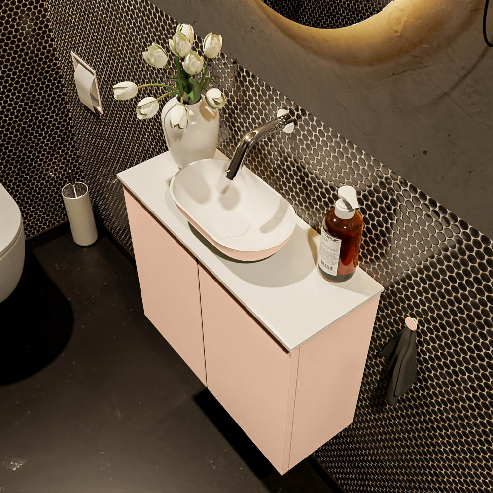 Met zijn fraai vormgegeven kom en elegant bovenblad, vervaardigd uit Solid Surface materiaal, straalt de toiletmeubel set FOWY stijl en klasse uit. De kleur van het kastje met zijn handige push-to-open deurtjes kan harmonieus worden afgestemd op de tint van de wastafelkom. Met deze set transformeert u moeiteloos uw toiletruimte tot een oase van prachtig design en luxe.