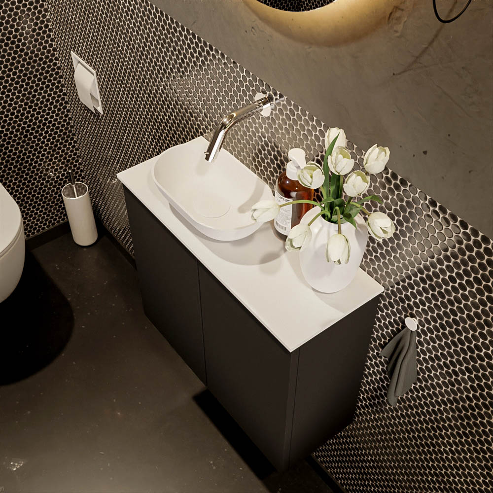 Met zijn fraai vormgegeven kom en elegant bovenblad, vervaardigd uit Solid Surface materiaal, straalt de toiletmeubel set FOWY stijl en klasse uit. De kleur van het kastje met zijn handige push-to-open deurtjes kan harmonieus worden afgestemd op de tint van de wastafelkom. Met deze set transformeert u moeiteloos uw toiletruimte tot een oase van prachtig design en luxe.