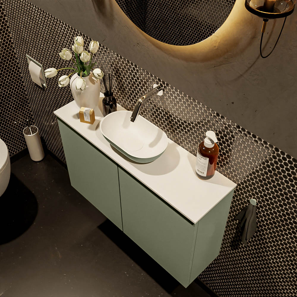 Met zijn fraai vormgegeven kom en elegant bovenblad, vervaardigd uit Solid Surface materiaal, straalt de toiletmeubel set FOWY stijl en klasse uit. De kleur van het kastje met zijn handige push-to-open deurtjes kan harmonieus worden afgestemd op de tint van de wastafelkom. Met deze set transformeert u moeiteloos uw toiletruimte tot een oase van prachtig design en luxe.