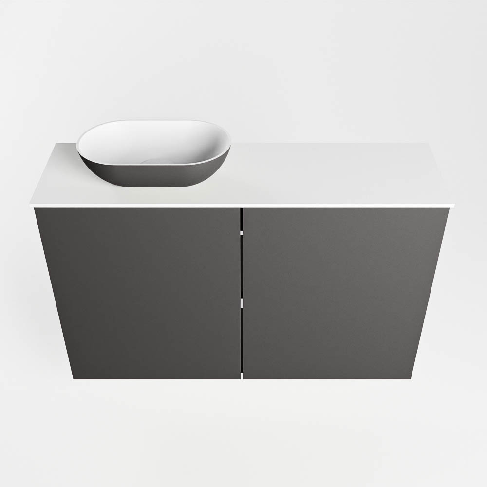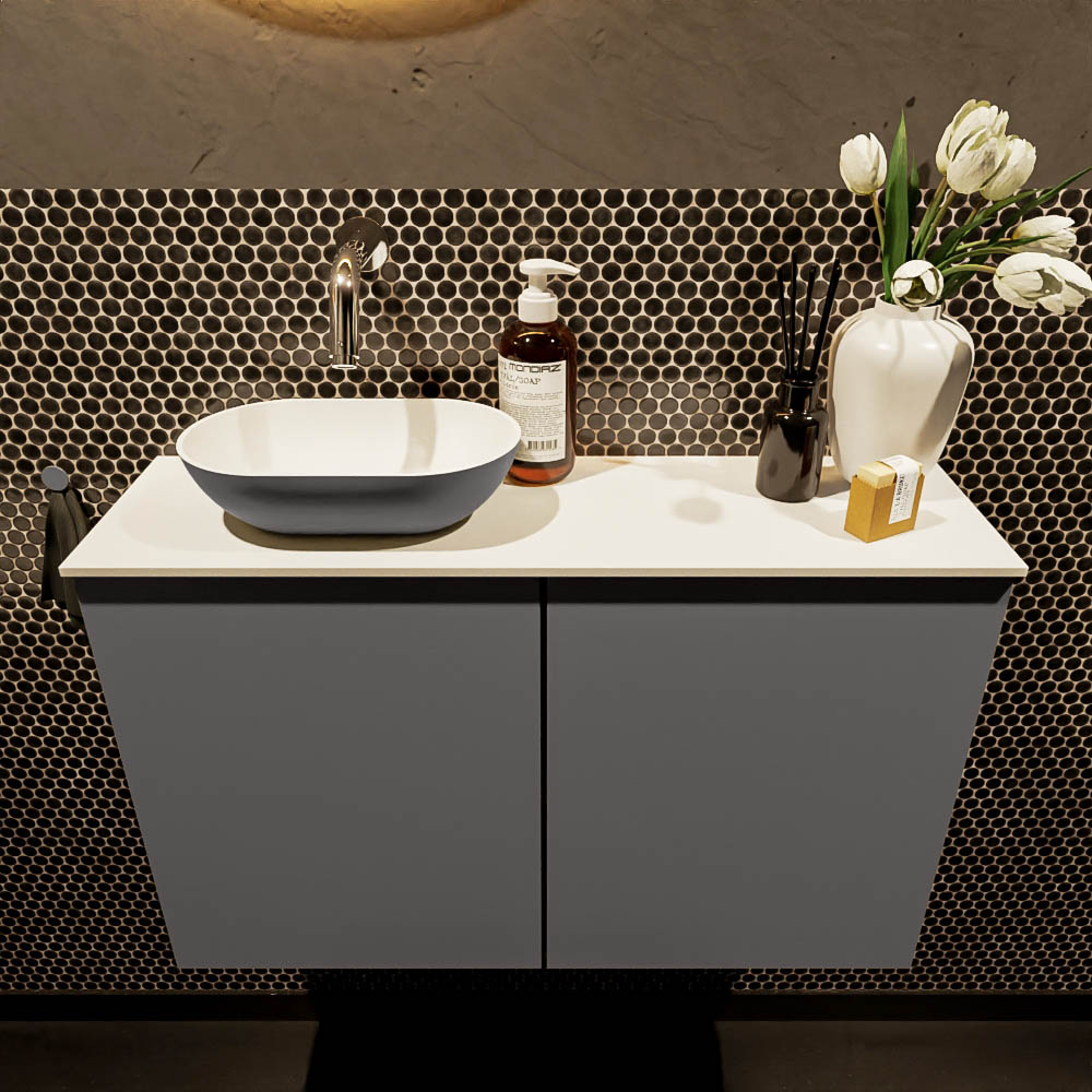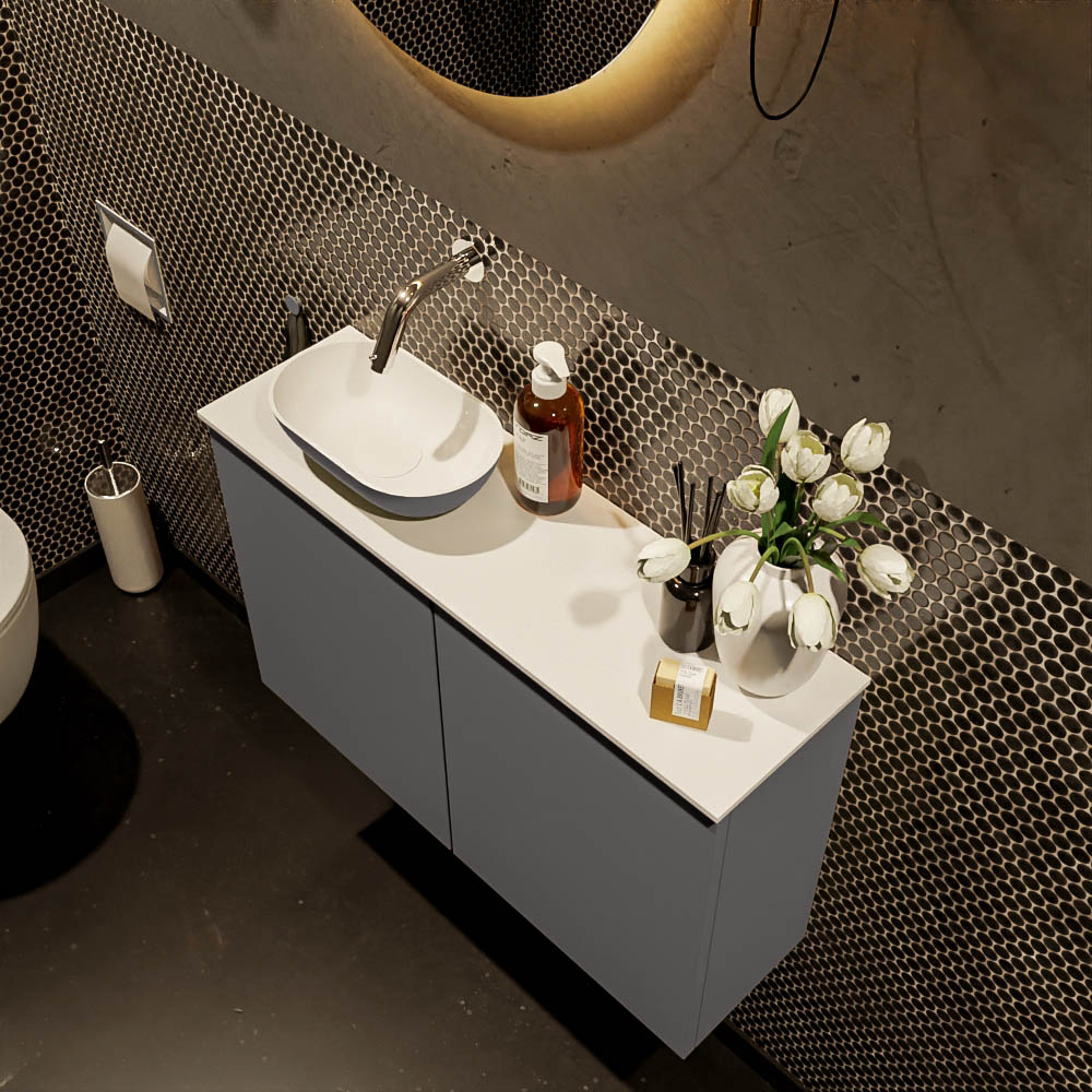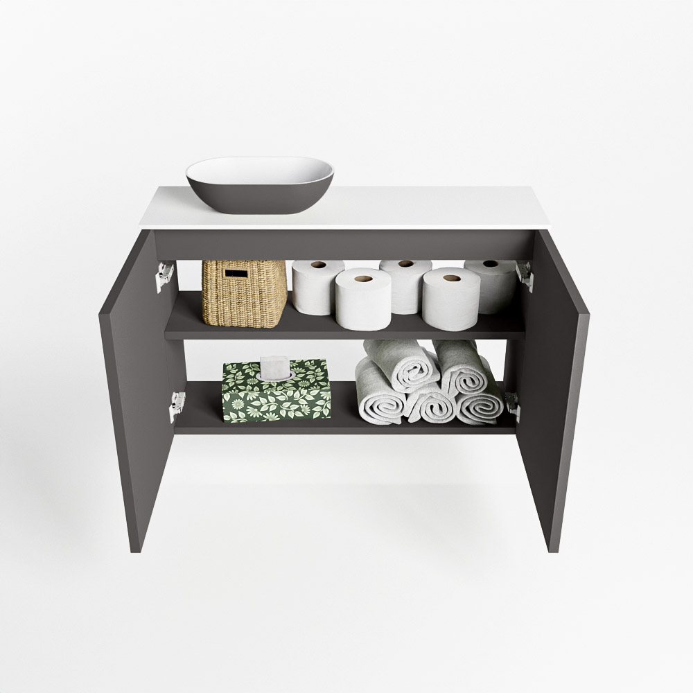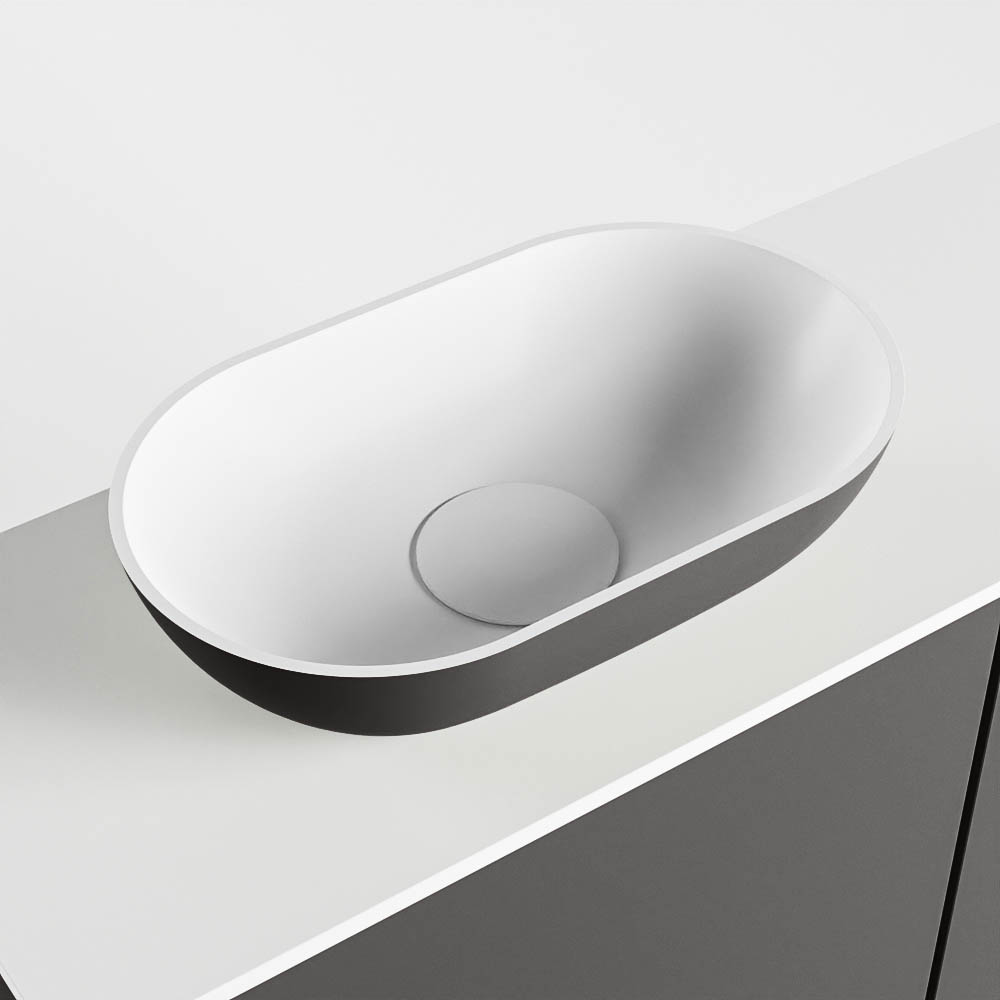 Met zijn fraai vormgegeven kom en elegant bovenblad, vervaardigd uit Solid Surface materiaal, straalt de toiletmeubel set FOWY stijl en klasse uit. De kleur van het kastje met zijn handige push-to-open deurtjes kan harmonieus worden afgestemd op de tint van de wastafelkom. Met deze set transformeert u moeiteloos uw toiletruimte tot een oase van prachtig design en luxe.