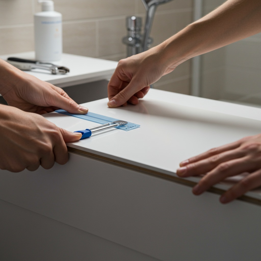 - Stap 3: Plaats het blad: Til het wastafelblad met twee personen op en plaats het voorzichtig op de onderkast. Zorg ervoor dat het aan alle kanten evenveel oversteekt. Druk het blad zachtjes en gelijkmatig aan.